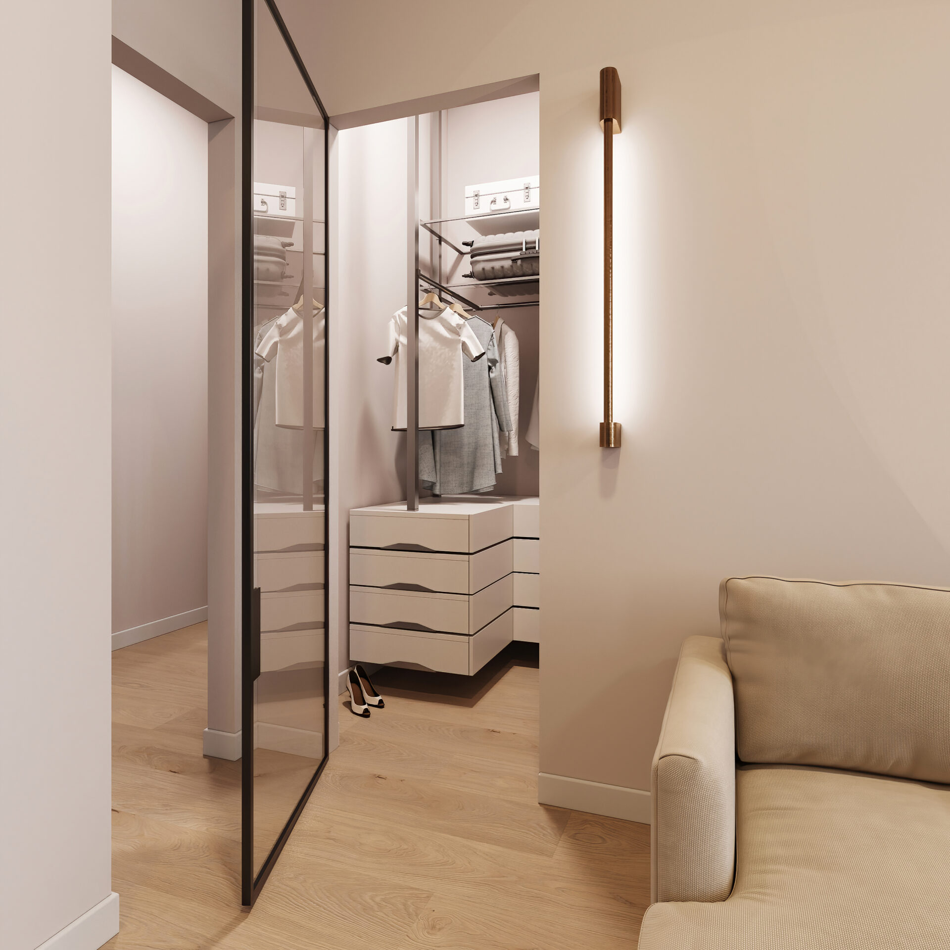 Interiér je navržen s důrazem na praktičnost, světlo a zachování původního charakteru. Dispozice zahrnuje obývací pokoj s kuchyní a jídelnou, jednu ložnici a koupelnu. Díky efektivnímu uspořádání nabízí byt komfortní městské bydlení v kompaktním formátu.