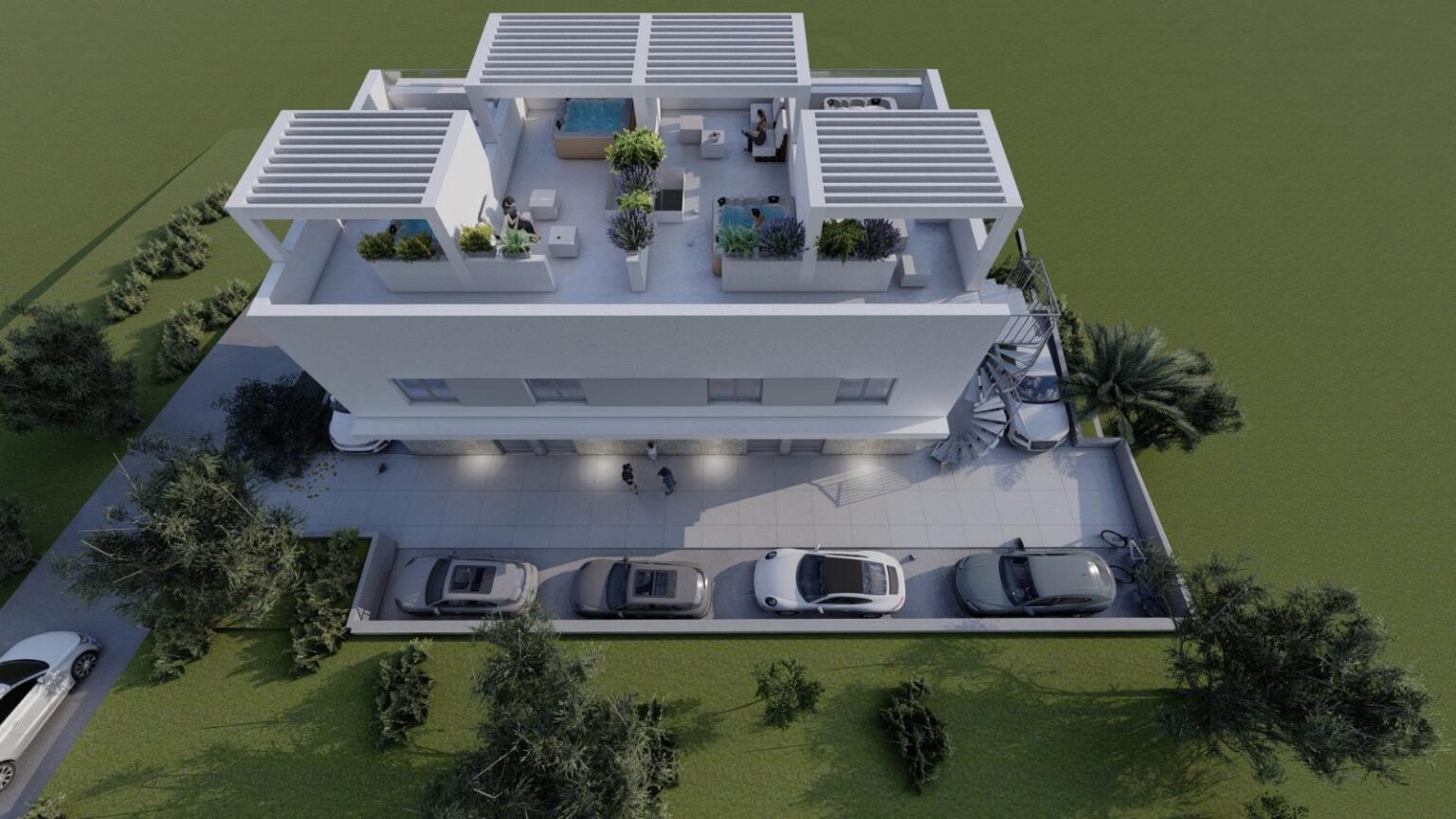 Horní patro nabízí dvě ložnice, dvě koupelny a krytý balkon s výhledem na okolí, celkem 34 m². Střešní terasa o ploše 23 m² je připravena pro instalaci vířivky, sprchy nebo venkovní kuchyně. Dvě z ložnic směřují k moři a mají skleněné stěny, které umožňují snadný přístup na balkon a zaručují ničím nerušený výhled na moře. Dům bude vybaven podlahovým topením, split klimatizací a kvalitními stavebními materiály, k dispozici je také jedno parkovací místo. Nemovitost se prodává bez vybavení, připravena k okamžitému nastěhování.