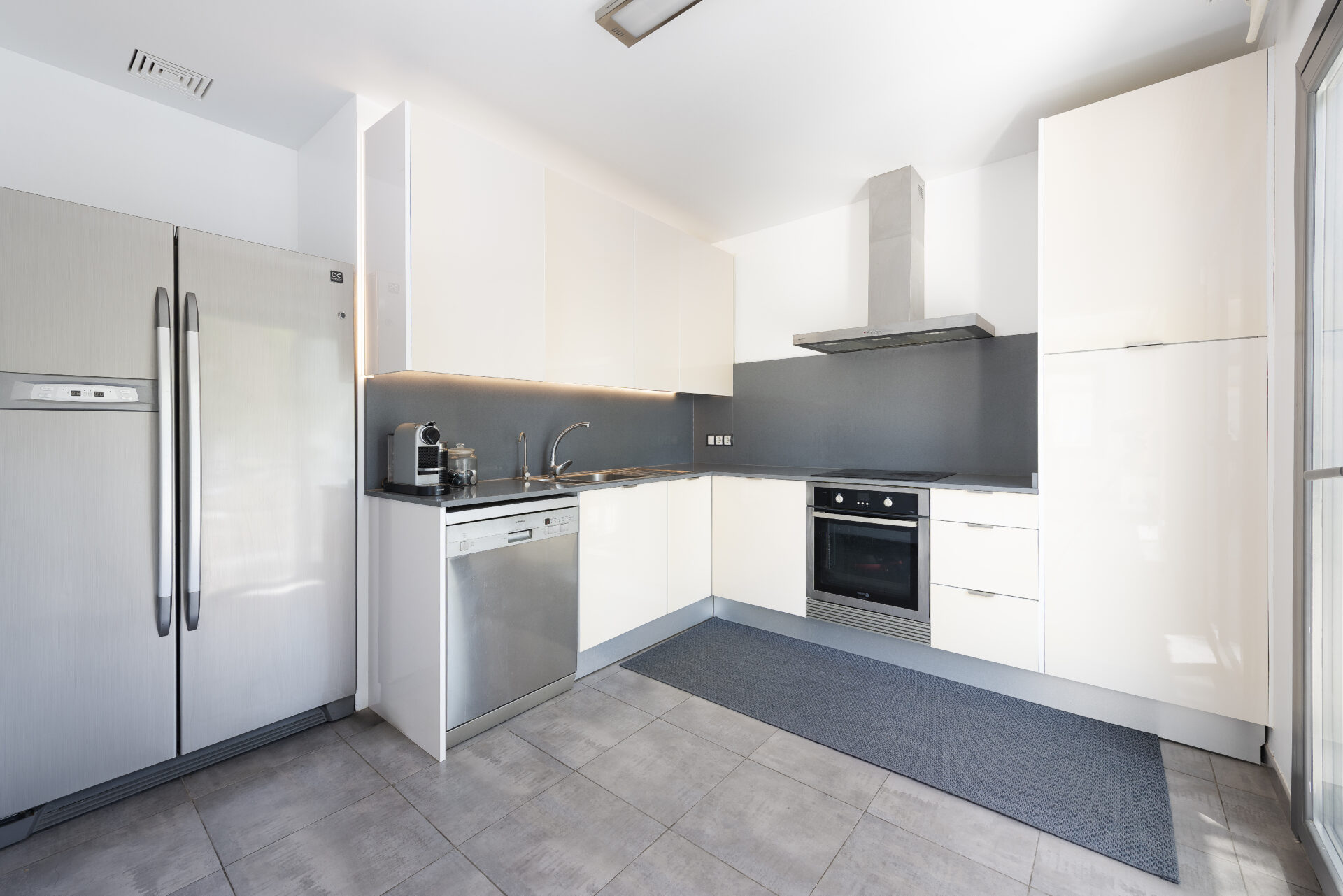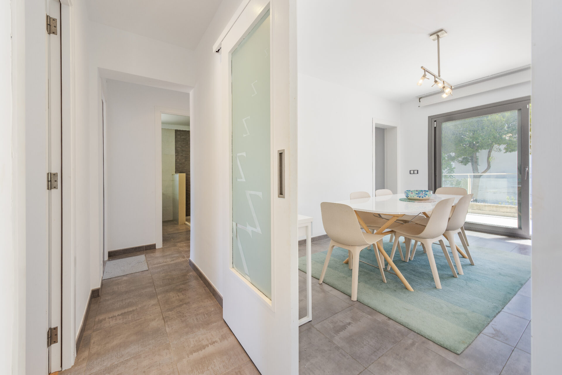 Interiér je navržen s důrazem na přirozené světlo a funkční uspořádání. Dispozice zahrnuje prostorný obývací pokoj s jídelní částí a přímým vstupem na terasu, plně vybavenou kuchyni, tři ložnice a koupelnu. Velká okna zajišťují dostatek světla a propojení interiéru s venkovním prostorem.